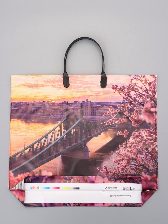 Подарочный пакет «Дунай» с пластиковой ручкой и дном — это упаковка, которая рассказывает историю. Нежный сиреневый фон с рисунком цветущего города и моста создает атмосферу европейского путешествия и романтичного настроения.