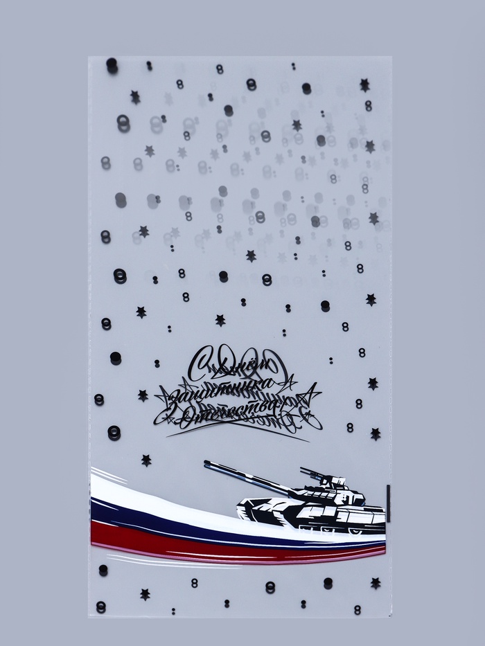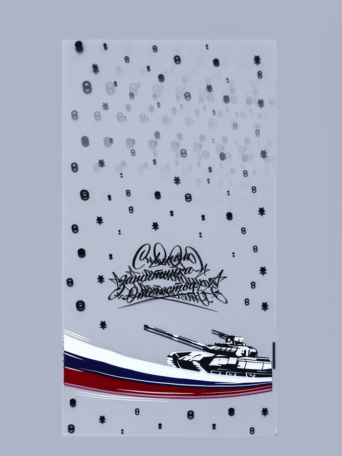Используйте пакет для упаковки сладостей, косметики, сувениров или небольших подарков на 23 Февраля. Он также подойдёт для хранения мелких вещей, продуктов или организации праздничного декора. Такой пакет станет не только практичным решением, но и добавит торжественности вашему подарку.
