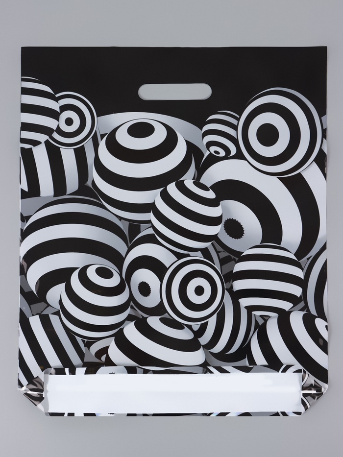 Графическая игра с восприятием. Подарочный пакет «Иллюзия» — это упаковка с оптическим узором. Контрастные полосы и шары создают динамичный визуальный эффект, притягивающий внимание.