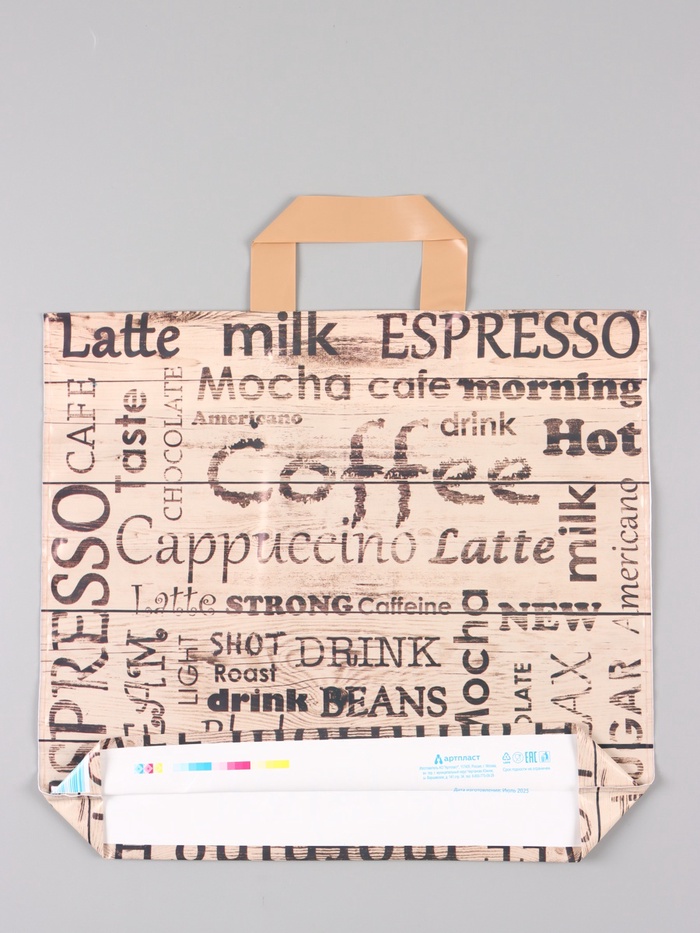 Фирменный пакет «Кофе-брейк» с петлевой ручкой – это прочный полиэтиленовый пакет с тематическим дизайном о кофе. Его стиль и вместимость подходят для продажи кофе, чая и сопутствующих товаров.
