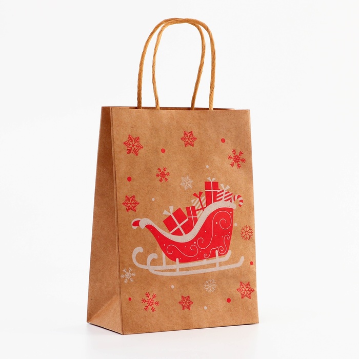 Пакет крафт с тиснением, круглая ручка, «Новогдние сани» 15×21×8 см, 120 г — Характеристики