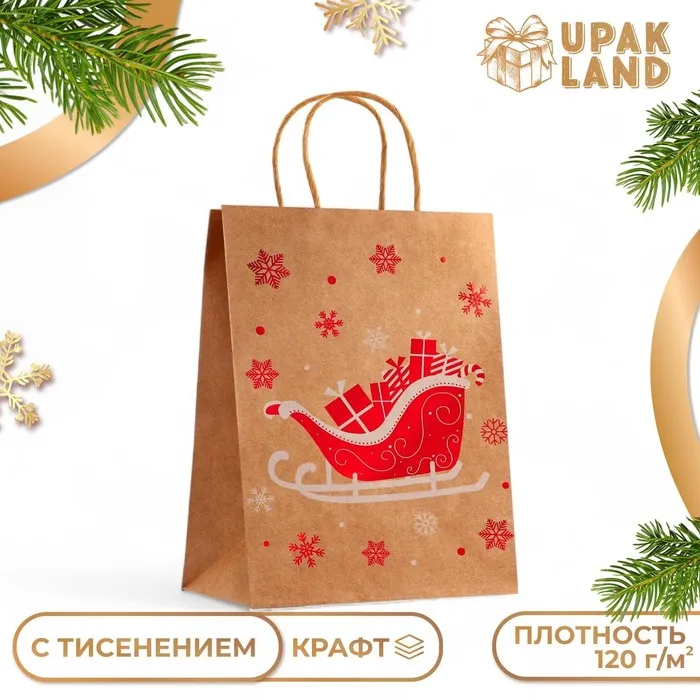 Пакет крафт с тиснением, круглая ручка, «Новогдние сани» 21×27×11 см, 120 г — Характеристики