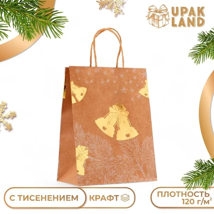 Пакет крафт с золотым тиснением, круглая ручка, «Колокольчик» 21×27×11 см, 120 г — Характеристики