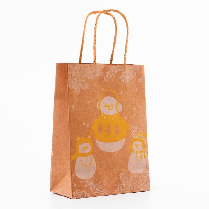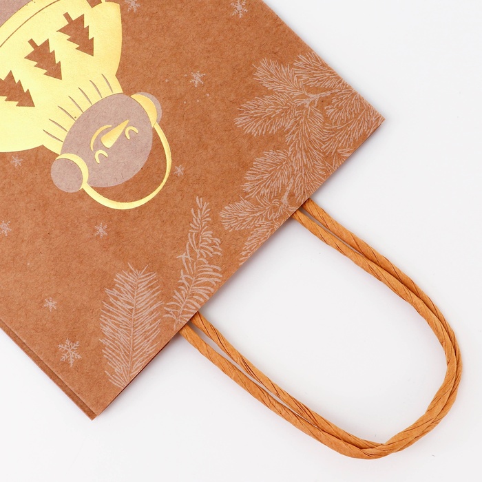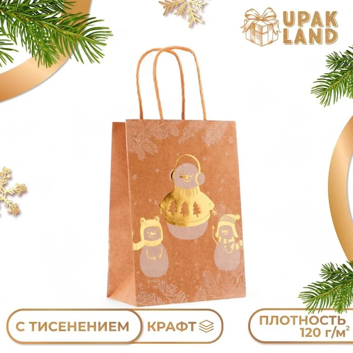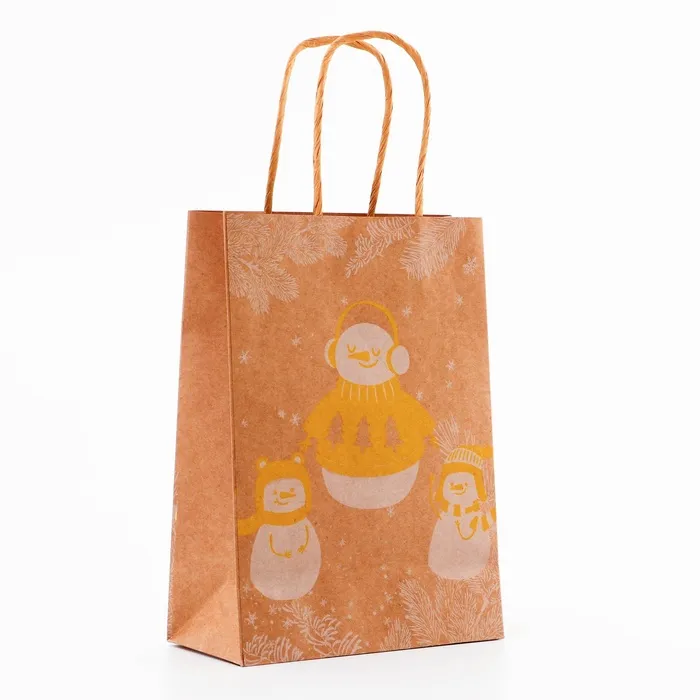 Пакет крафт с золотым тиснением, «Снеговик» круглая ручка, 15×21×8 см, 120 г — Характеристики