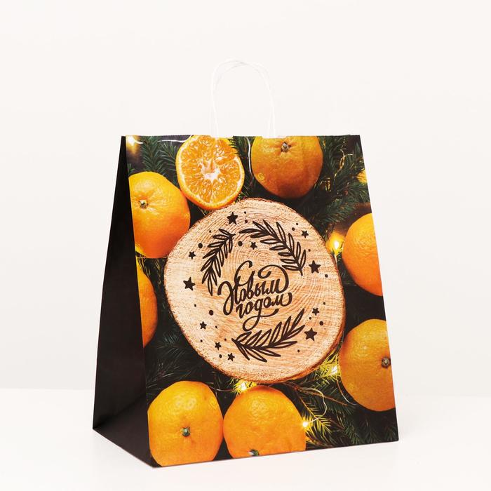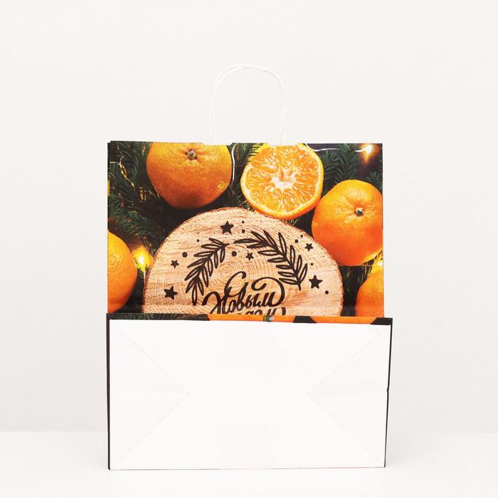 Новогодний подарочный пакет с ярким, красочным рисунком создаст праздничное настроение.