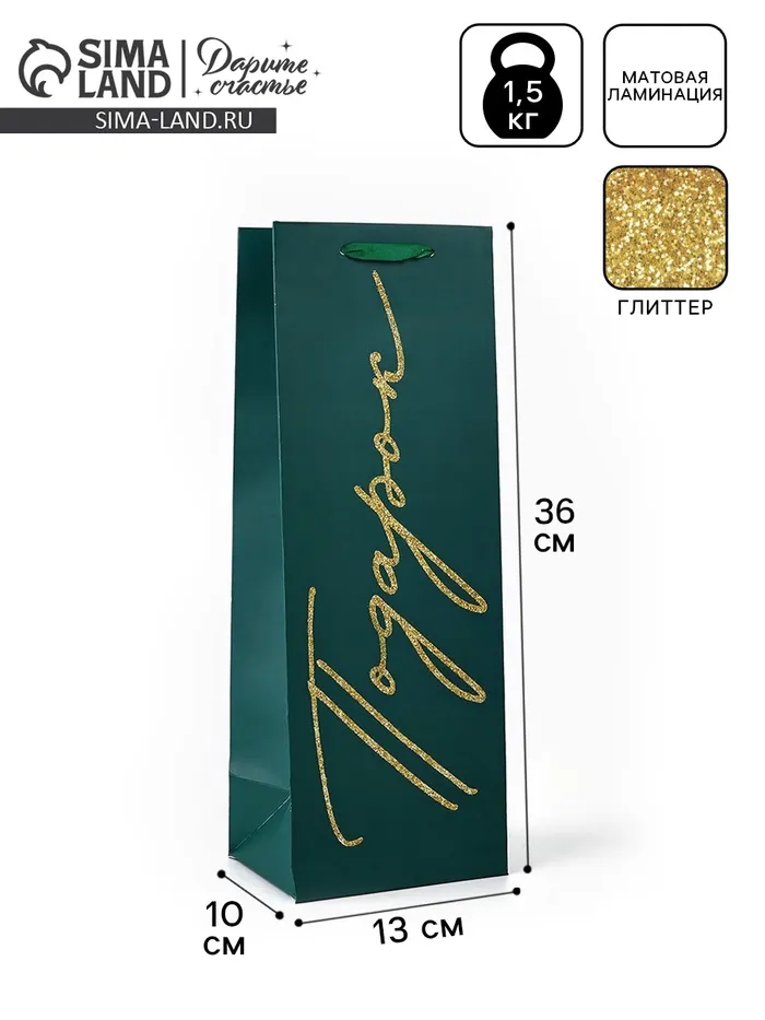 Пакет ламинированный под бутылку «Подарок», глиттер, 13 х 36 х 10 см — Характеристики