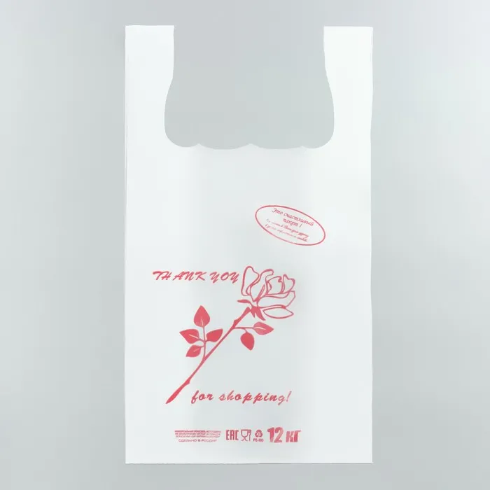 Элегантная благодарность вашим клиентам! Белый пакет-майка с цветочным принтом и надписью «Спасибо за покупку» — это изящное решение для упаковки товаров в фирменном стиле. Сочетание эстетики и функциональности делает его идеальным выбором для бутиков и магазинов подарков.