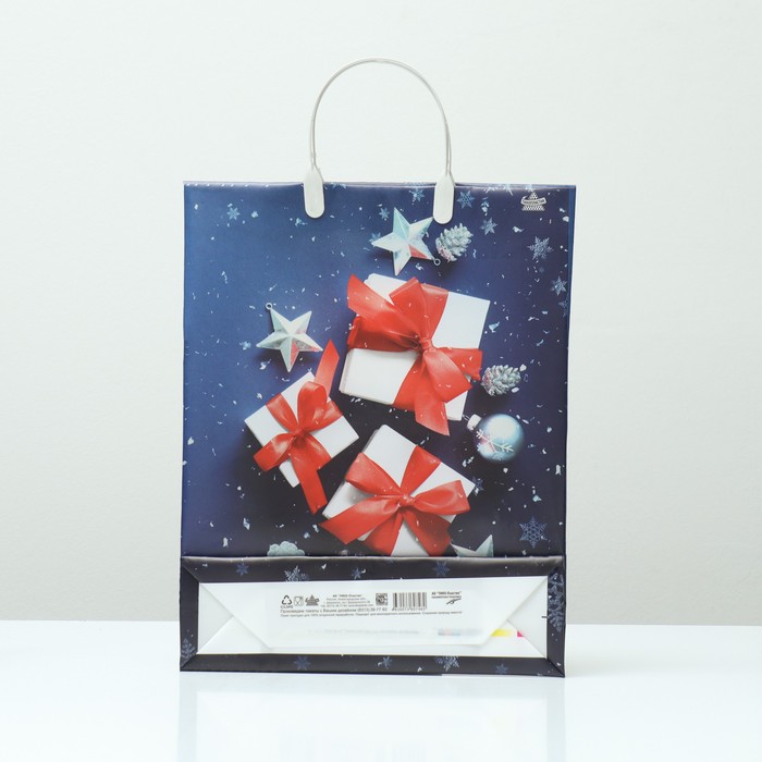 Новогодний подарочный пакет с ярким, красочным рисунком создаст праздничное настроение.
