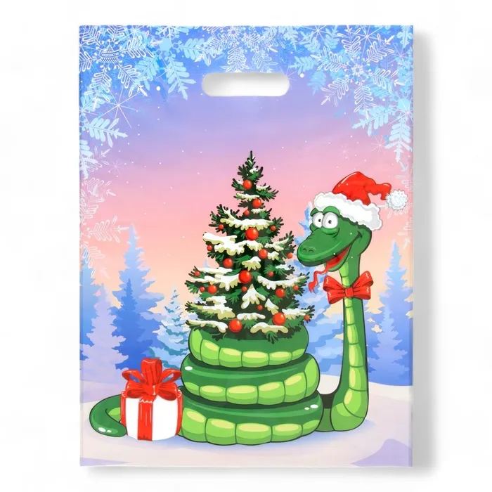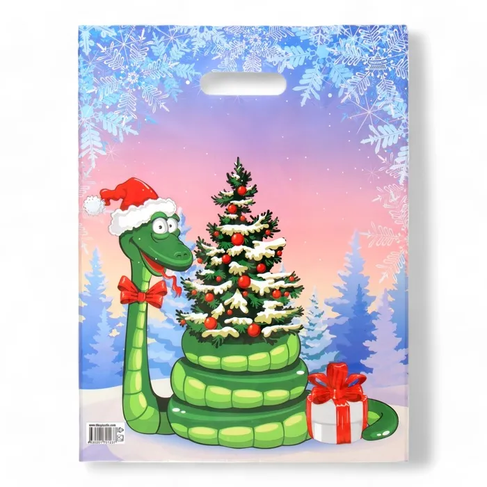 Новогодний пакет полиэтиленовый с вырубной ручкой - это удобный и практичный аксессуар для переноски покупок или упаковки подарков.