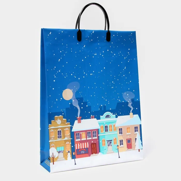 Пакет имеет яркий и красочный дизайн с изображением новогодних домов, что придает ему праздничный и уютный вид. Это делает его идеальным выбором для использования в качестве подарочной упаковки на различные зимние праздники, такие как Новый год или Рождество.