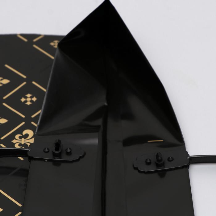- Плотный материал 90 мкм: Увеличенная толщина полиэтилена делает пакет особенно прочным и жестким. Он не мнется, прекрасно держит форму, а золотой принт на черном фоне выглядит контрастно и дорого.