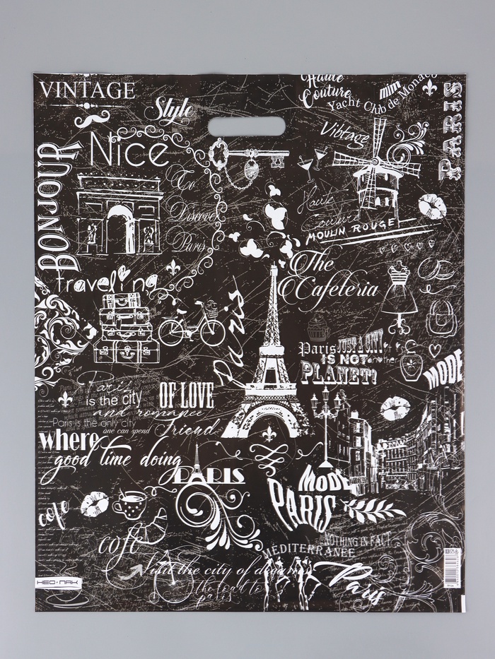 - Контрастный дизайн с городской символикой: Белые контурные рисунки Эйфелевой башни и надписи «Paris» на чёрном фоне выглядят как графичная иллюстрация из путеводителя. Такой пакет подходит для подарка человеку, увлекающемуся путешествиями, архитектурой или просто ценящему строгую эстетику.