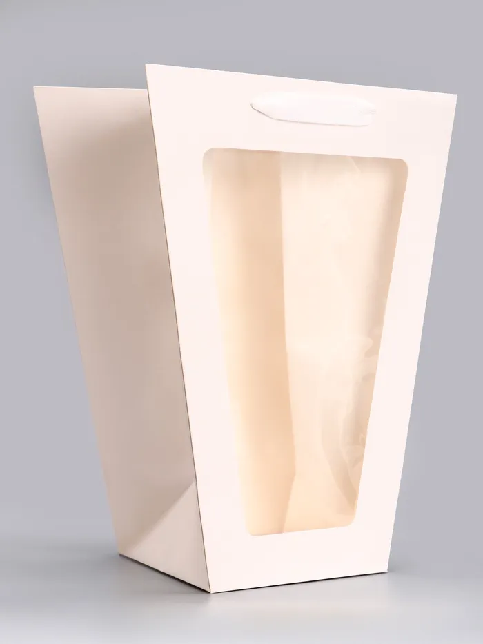Элегантная упаковка для цветов! Белый пакет-переноска в форме трапеции – это стильное и практичное решение для транспортировки букетов, горшечных растений или подарков. Его лаконичный дизайн подчеркивает естественную красоту содержимого, делая акцент на самом главном.