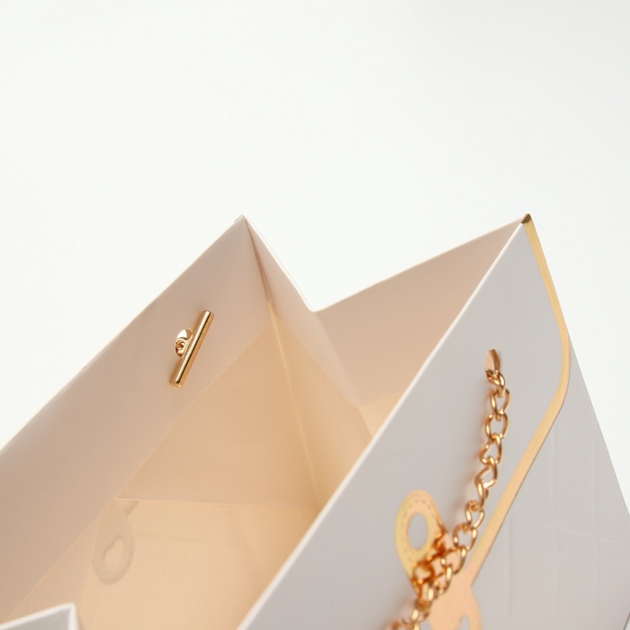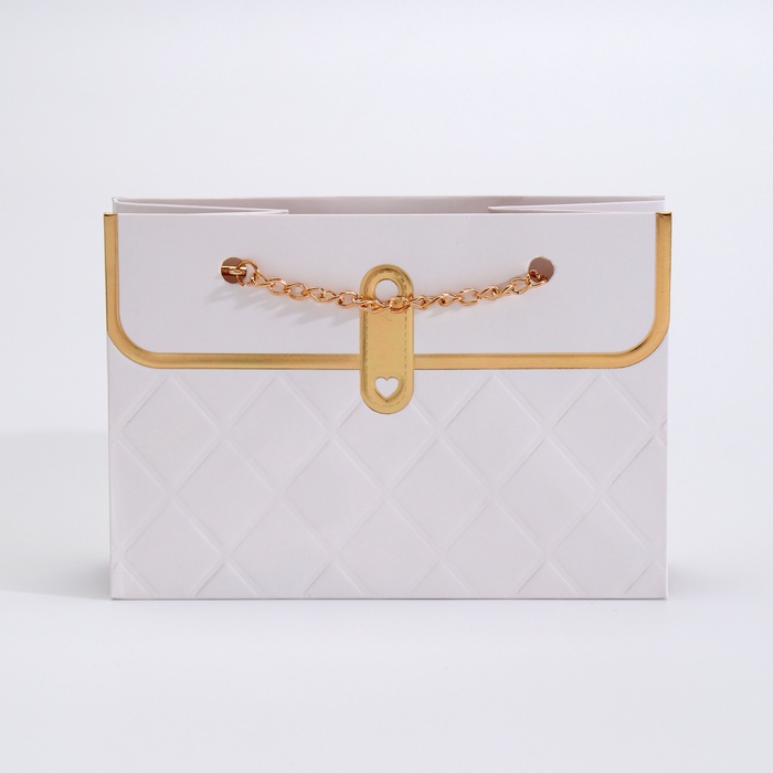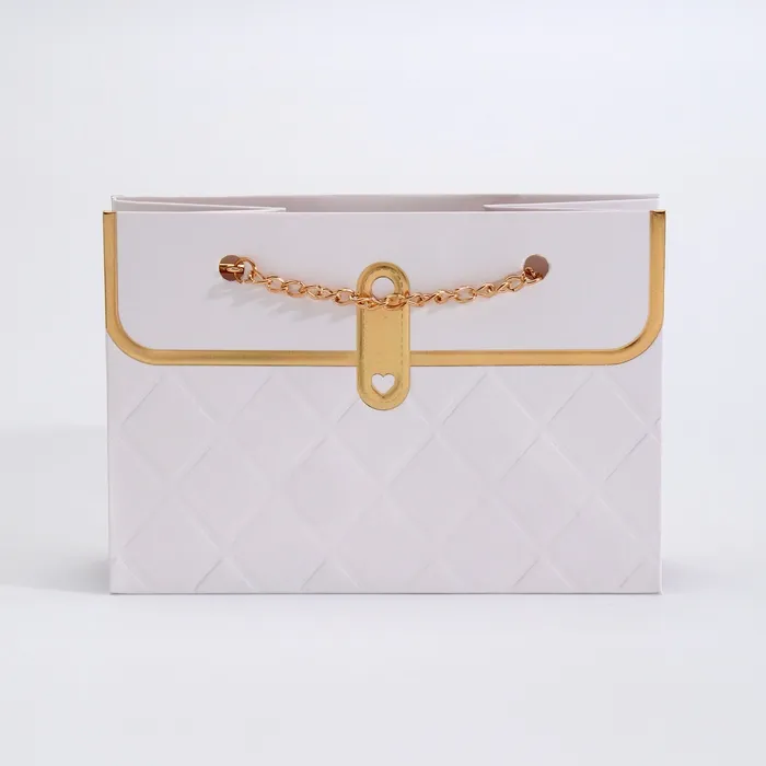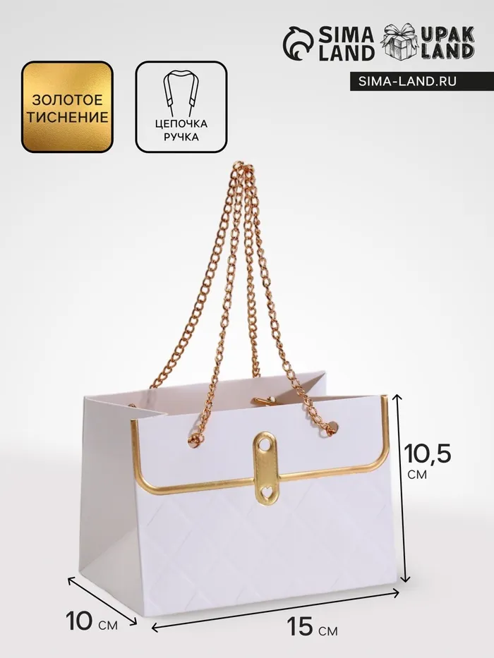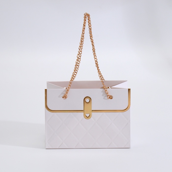 Роскошная подача для особенных букетов! Белая переноска для цветов с золотым тиснением — элегантная упаковка с металлической цепью вместо ручки. Компактный размер (15×10,5×10 см) подчеркивает ценность каждого цветка в композиции.