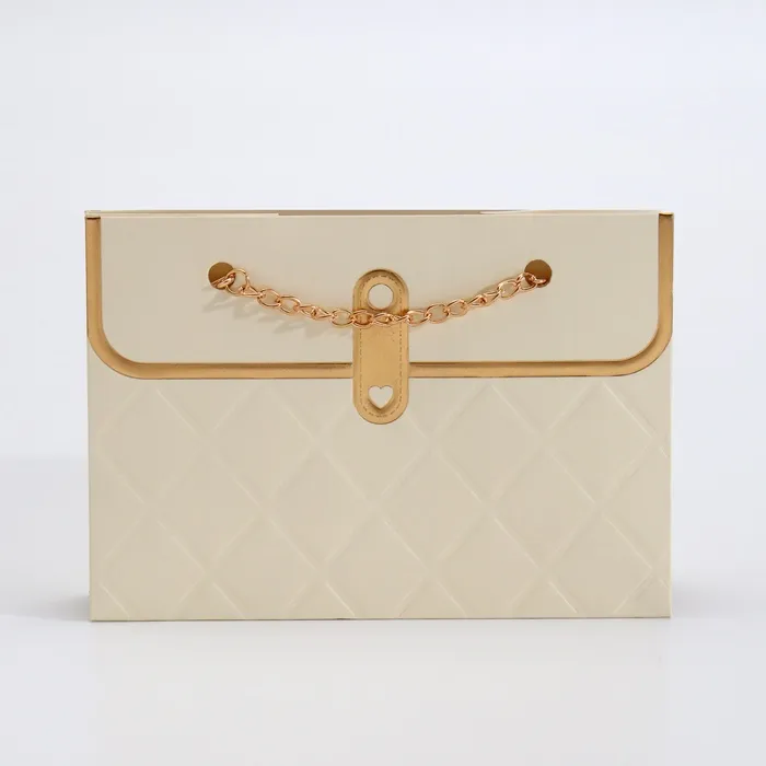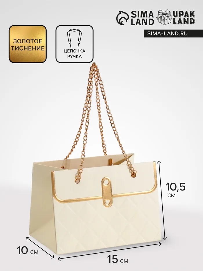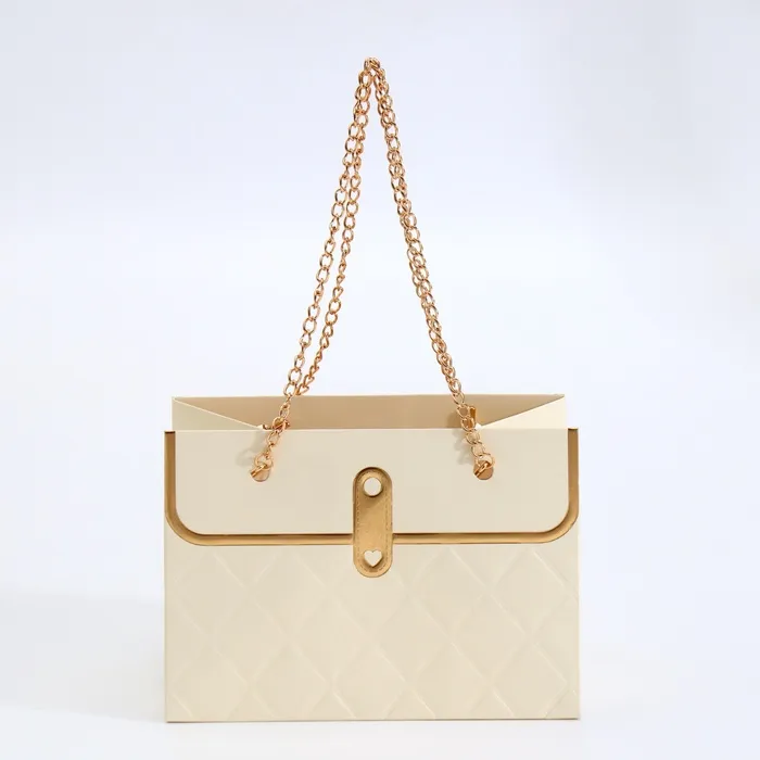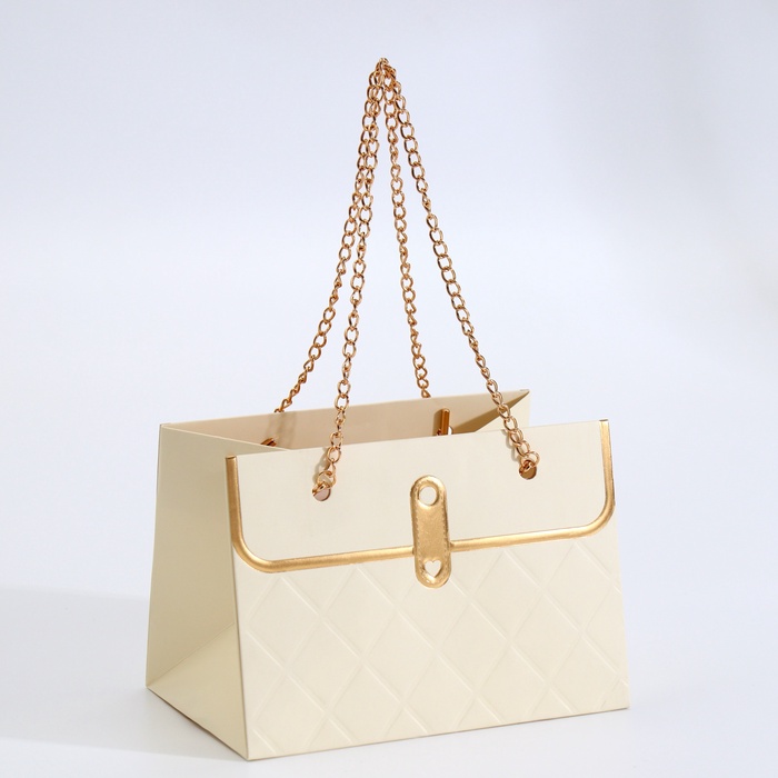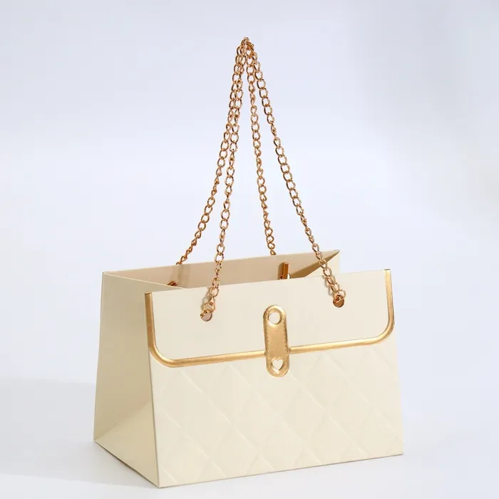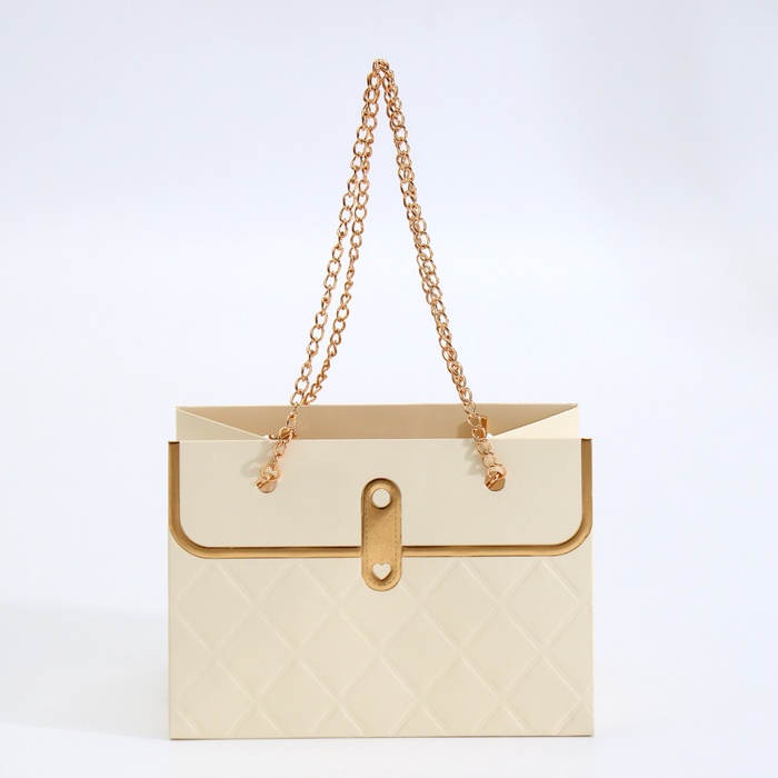 Элегантная упаковка для самых нежных букетов! Кремовый подарочный пакет с цепью — стильное решение для тех, кто ценит утонченность. Золотое тиснение на бежевом фоне создает благородный образ, превращая обычный букет в изысканный подарок.
