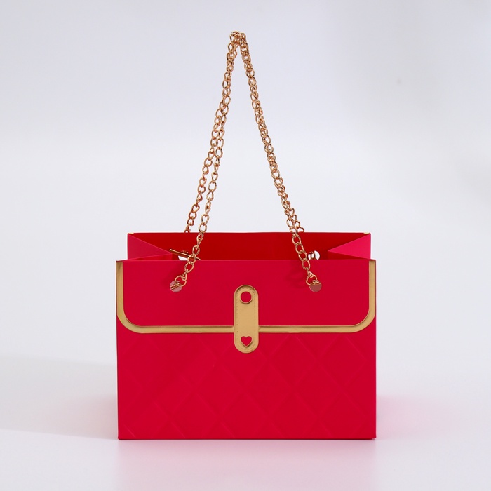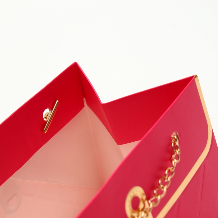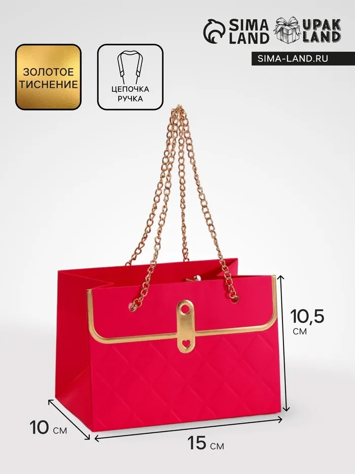 Главное украшение пакета — изящная цепочка, выполняющая функцию ручки. Она не только придаёт изделию элегантный вид, но и обеспечивает удобство при переноске. Золотое тиснение на поверхности добавляет пакету особого шика, создавая утончённый и праздничный акцент. Оно подчёркивает внимание к деталям и делает упаковку визуально привлекательной.