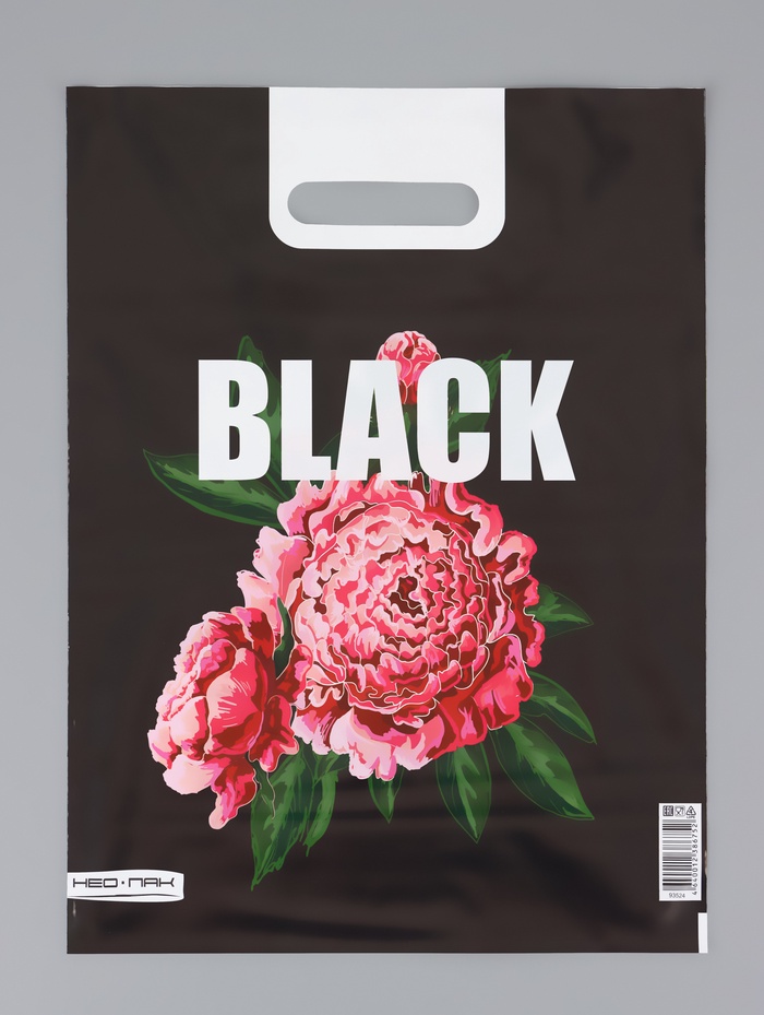 - Стильный контрастный дизайн: Графичное изображение пионов на контрастном фоне выглядит современно и утончённо. Такой пакет подходит для подарка женщине или девушке, ценящей неброскую элегантность.