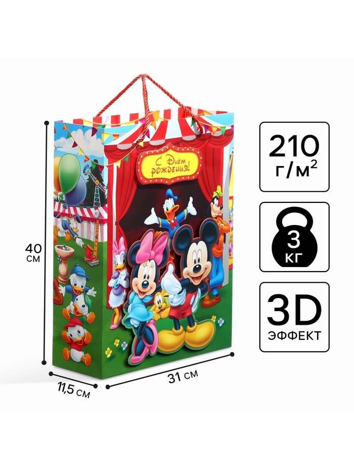 Пакет подарочный 3Д «С днём Рождения!», 40×31×11.5 см, Микки Маус — Характеристики