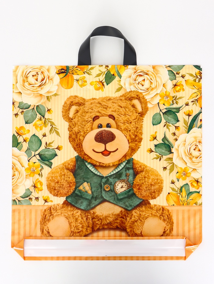 Для детских магазинов и семейных праздников: Донная складка обеспечивает устойчивость во время игр с подарком. Бежевый фон маскирует мелкие загрязнения. Пакет используют для упаковки развивающих наборов, конструкторов, мягких игрушек и праздничных аксессуаров. Петлевая ручка удобна для детей младшего возраста.