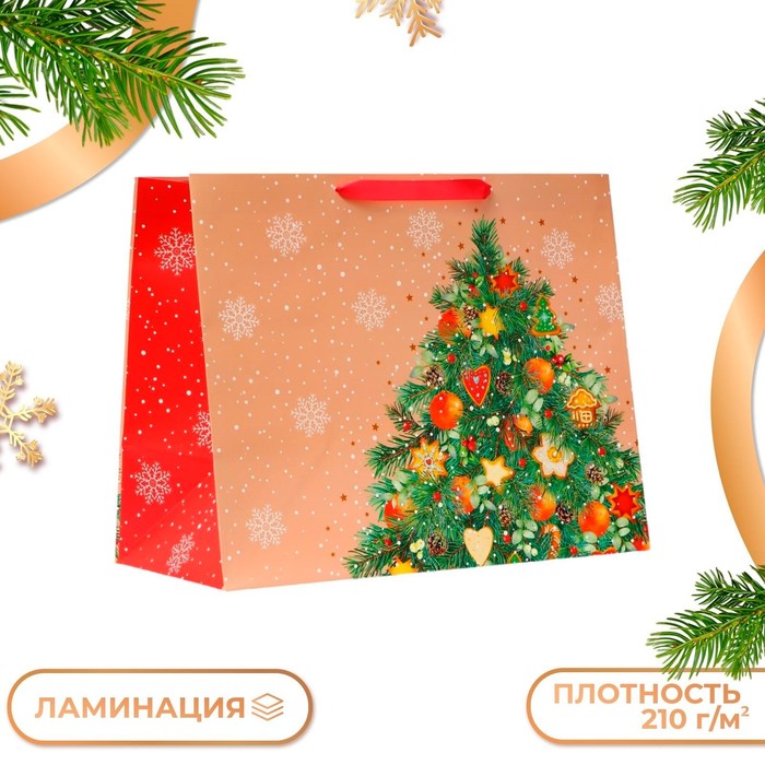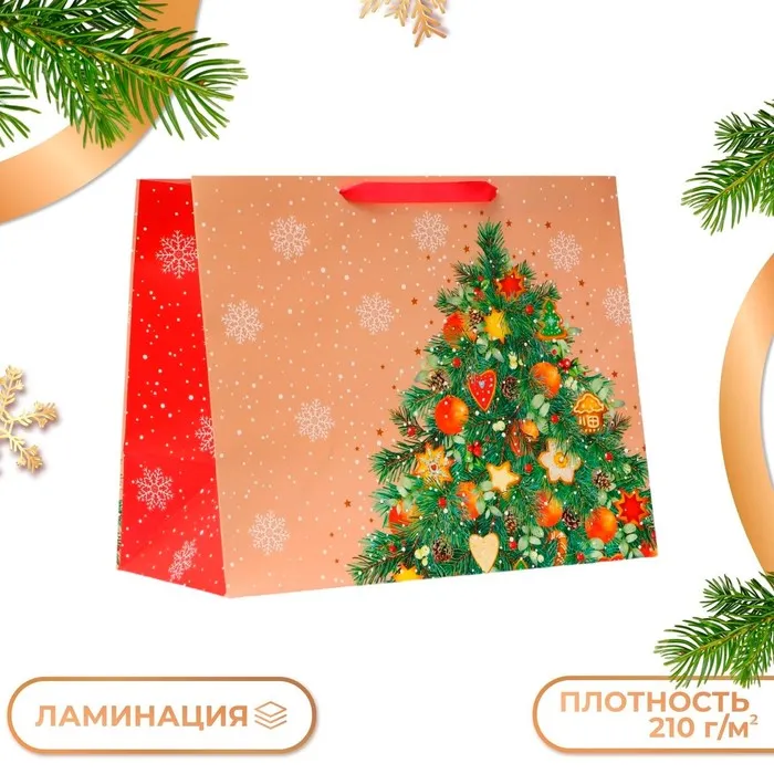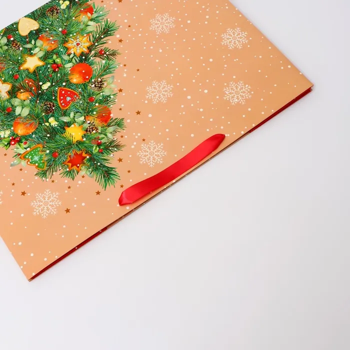 Подарочный новогодний пакет имеет оптимальные размеры, позволяющие упаковать различные предметы, от небольших сувениров до крупных подарков. Он также может быть использован для хранения и транспортировки продуктов питания, например сладких подарков под ёлку, так как материал, из которого он изготовлен, является безопасным для контакта с пищевыми продуктами.