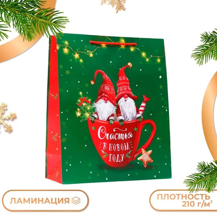 Пакет подарочный новогодний изготовлен из прочного и качественного материала, включая картон, текстиль и высококачественную бумагу.
