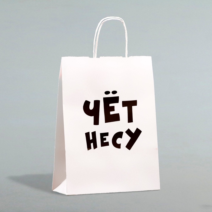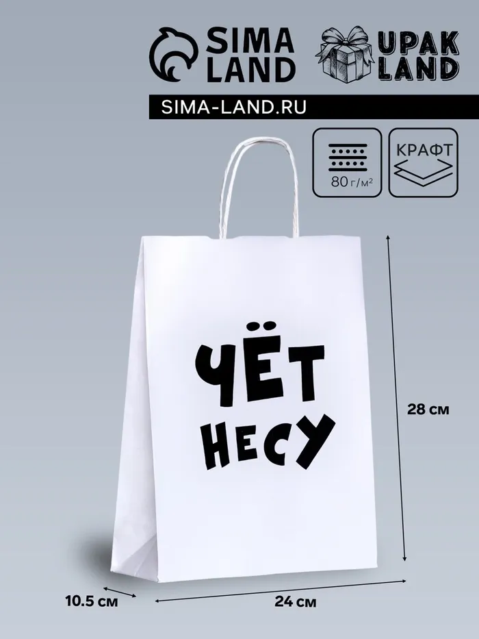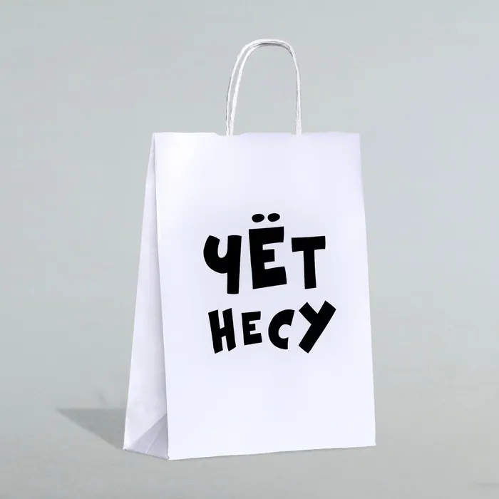 - Универсальный дизайн: Черно-белый крафт с надписью «Чёт несу» подойдет для мужчин и женщин. Упакуйте книгу, косметику, гаджеты или бутылку вина — сюрприз будет выглядеть стильно.