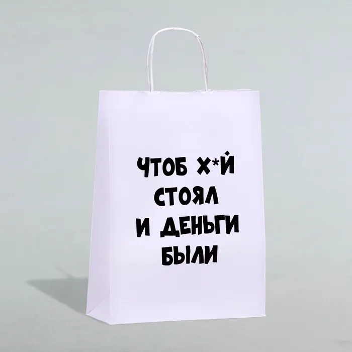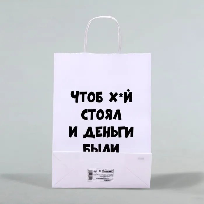 Подарок с мужским характером! Крафт-пакет с провокационной надписью — оригинальная упаковка для тех, кто ценит острый юмор. Плотная крафт-бумага с кручёным шпагатом выдерживает до 3 кг, а смелая фраза добавит пикантности вашему презенту.