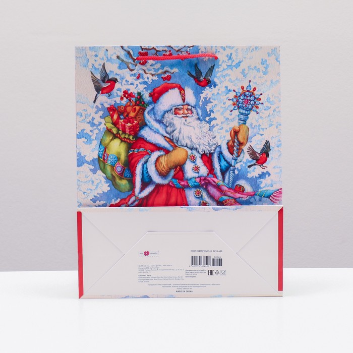 Новогодний подарочный пакет с ярким, красочным рисунком создаст праздничное настроение.