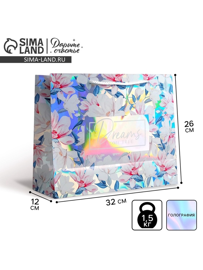 Пакет подарочный голографический, упаковка, Dreams come true, 32 х 26 х 12 см — Характеристики