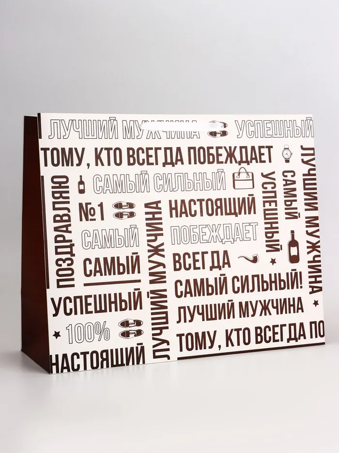 Солидная упаковка для мужских подарков! Подарочный пакет «Лучший мужчина» — горизонтальный формат XXL с ламинацией и лаконичным дизайном. Бело-бордовая гамма и тематические надписи создают строгий, но праздничный образ.