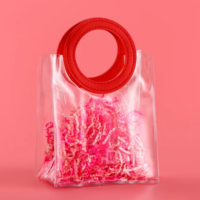 - Прозрачная сумочка с фигурной ручкой идеально подходит для различных видов подарков, начиная от косметики и заканчивая небольшими предметами интерьера.