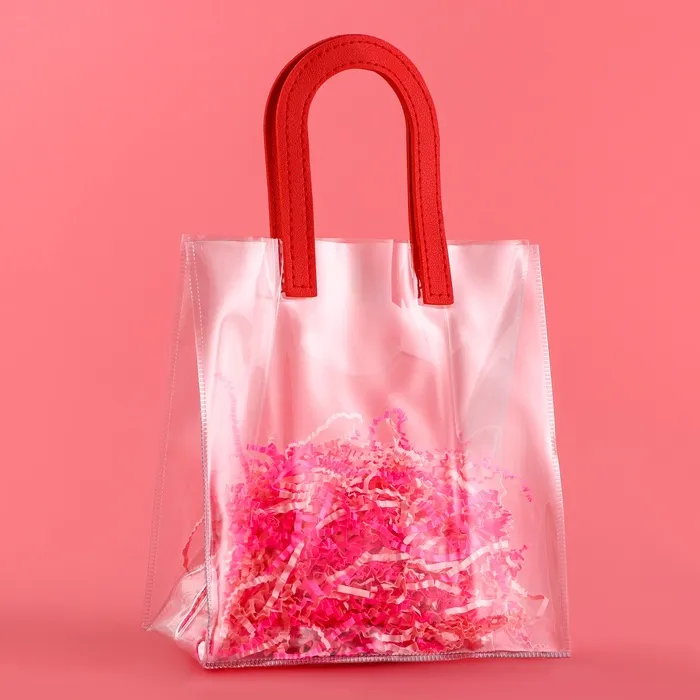 - Прозрачная сумочка с фигурной ручкой идеально подходит для различных видов подарков, начиная от косметики и заканчивая небольшими предметами интерьера.