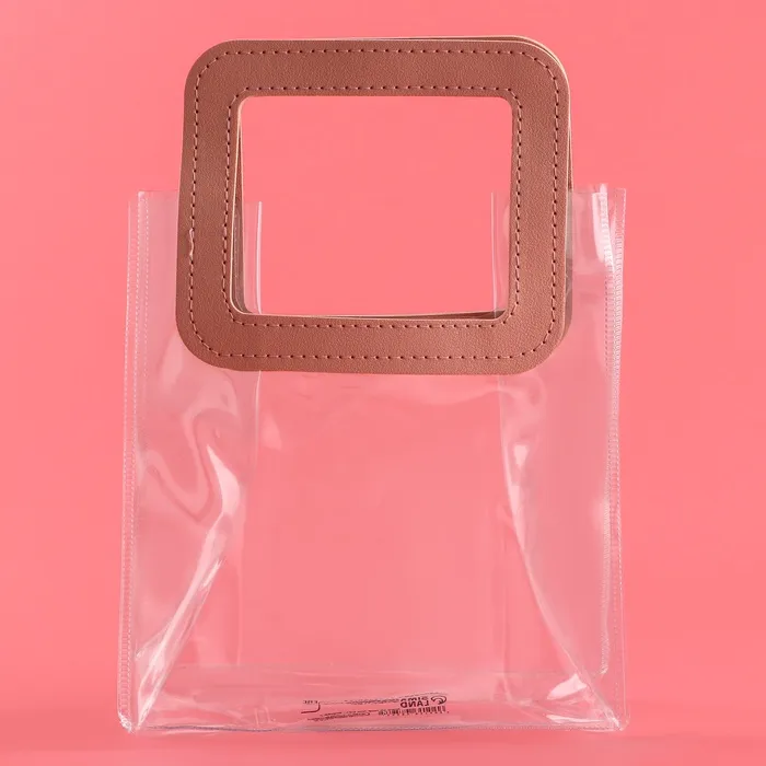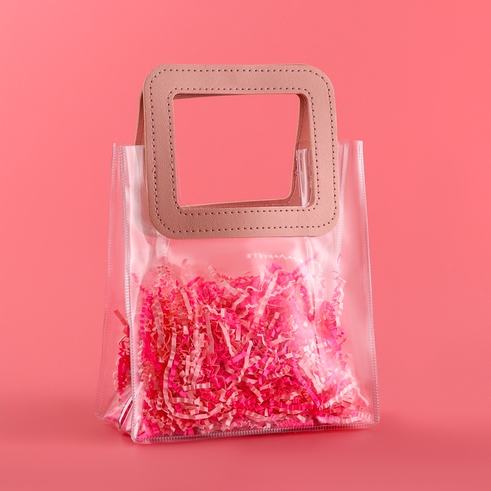 - Прозрачная сумочка с фигурной ручкой идеально подходит для различных видов подарков, начиная от косметики и заканчивая небольшими предметами интерьера.