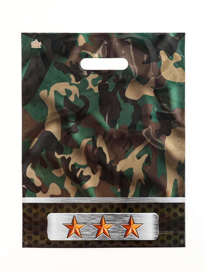 Надёжность в военном стиле! Подарочный пакет «Камуфляж» с вырубной ручкой — это практичное решение для подарков мужчинам. Классический камуфляжный принт и звёзды создают строгий военный образ.