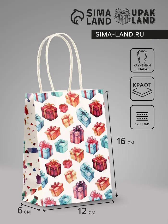 Пакет подарочный крафт «Подарки», 12×6×16 см — Характеристики