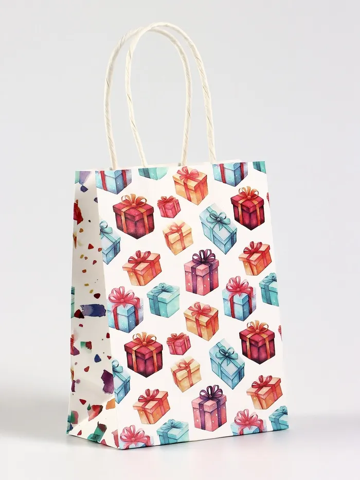 Крафт-пакет «Подарки» сочетает в себе праздничность и практичность. Его универсальный дизайн подходит для подарков на День рождения, детские праздники или другие торжества. Благодаря прочному материалу и яркому оформлению, он станет запоминающимся дополнением к вашему сюрпризу.