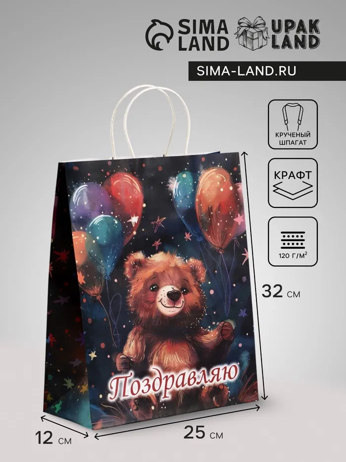 Пакет подарочный крафт «Поздравление от мишки», 25×12×32 см — Характеристики
