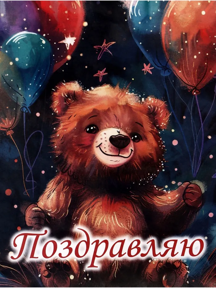 - Яркий рисунок с мишкой и праздничными элементами поднимает настроение.