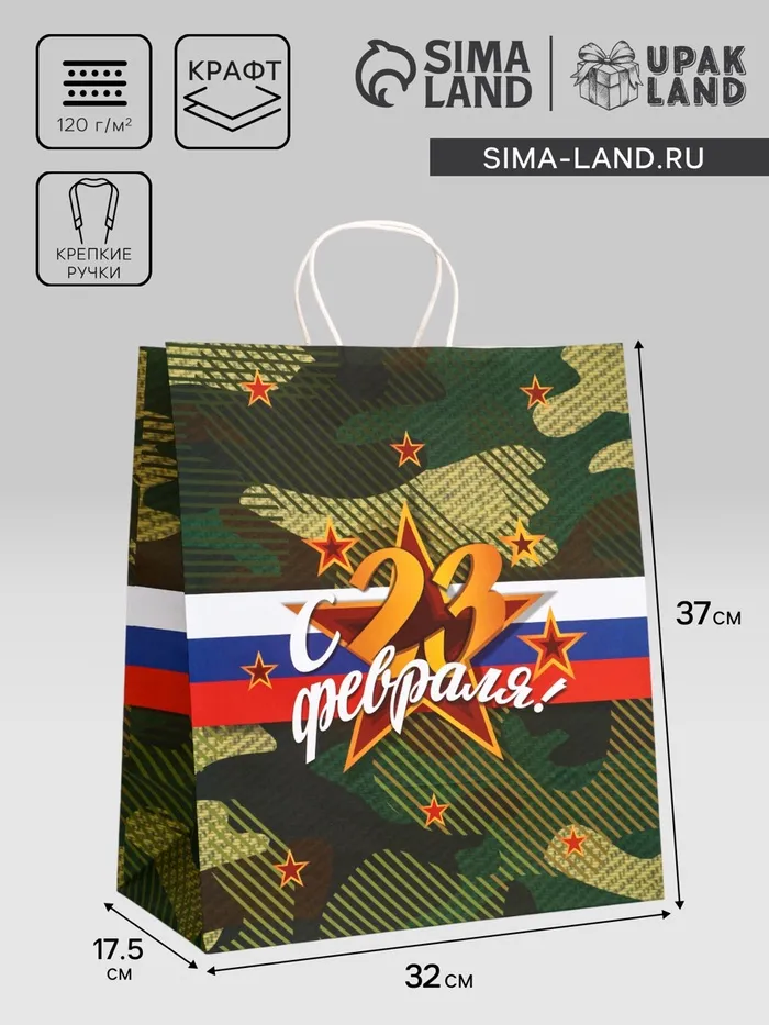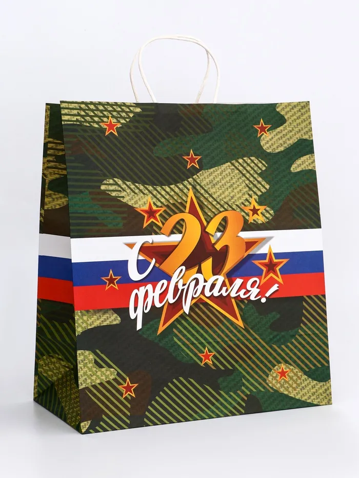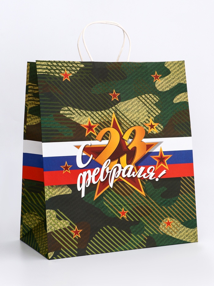 Пакет подарочный крафт «С 23 Февраля!» 32×17.5×37 См — Характеристики