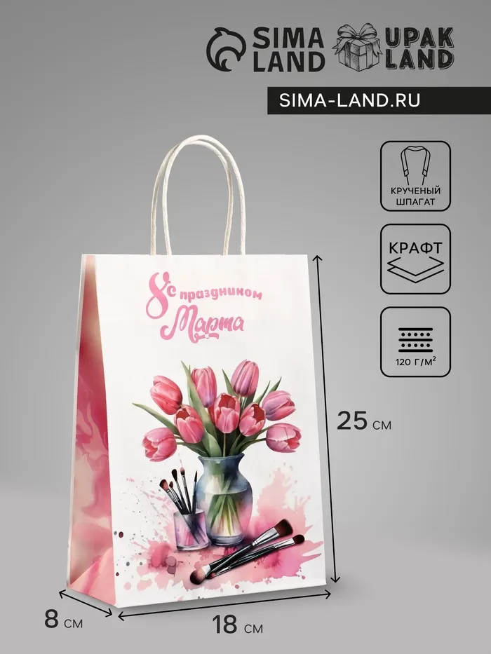 Пакет подарочный крафт, «С 8 Марта!» 18×8×25 см — Характеристики