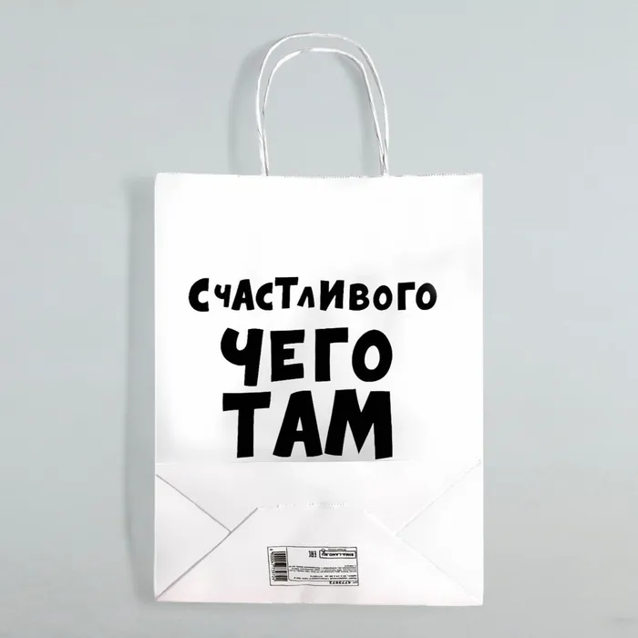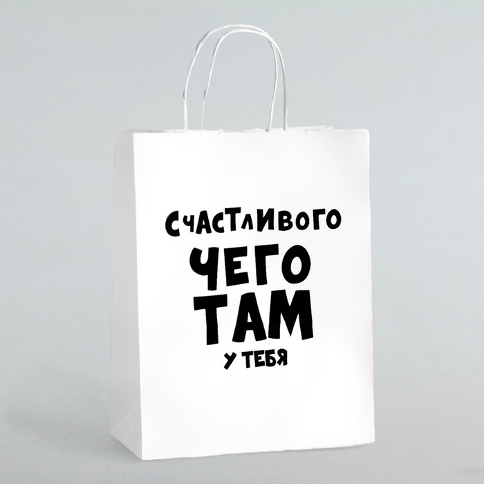 - Универсальная фраза для любого праздника: Надпись «Счастливого чего там у тебя» на контрастном крафте подходит ко дню рождения, новому году или просто без повода. Такой пакет избавляет от поиска тематической упаковки и создает непринужденную атмосферу.