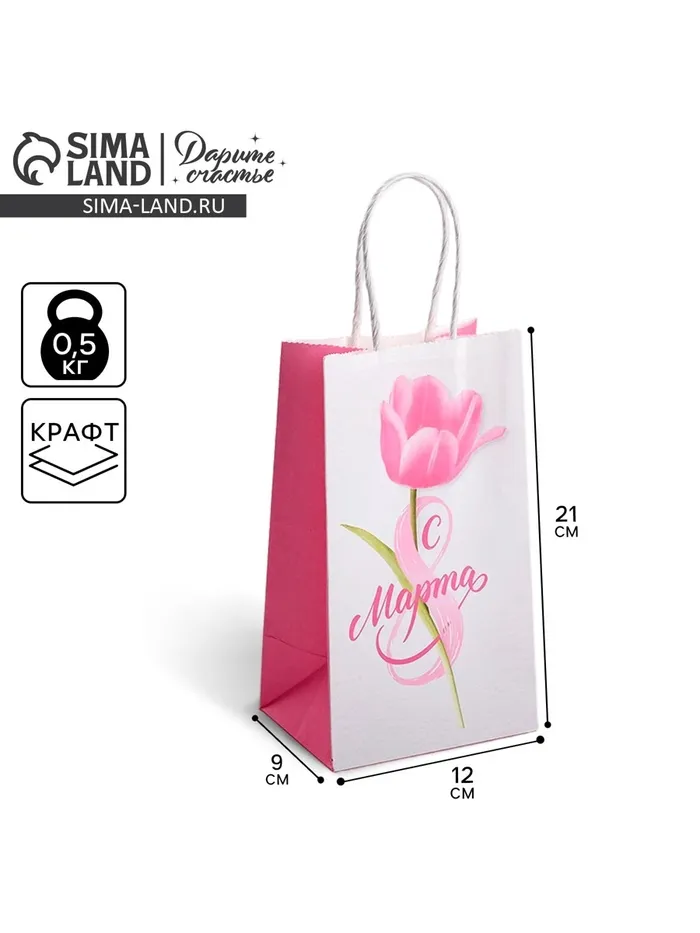 Пакет подарочный крафт, упаковка, «С 8 Марта», 12 х 21 х 9 см — Характеристики