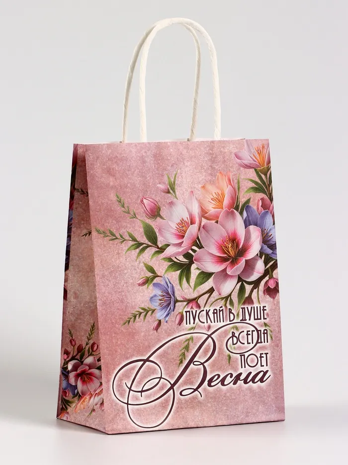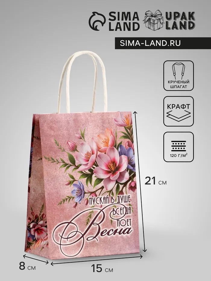 Пакет подарочный крафт, «Весна!», 15×8×21 см — Характеристики