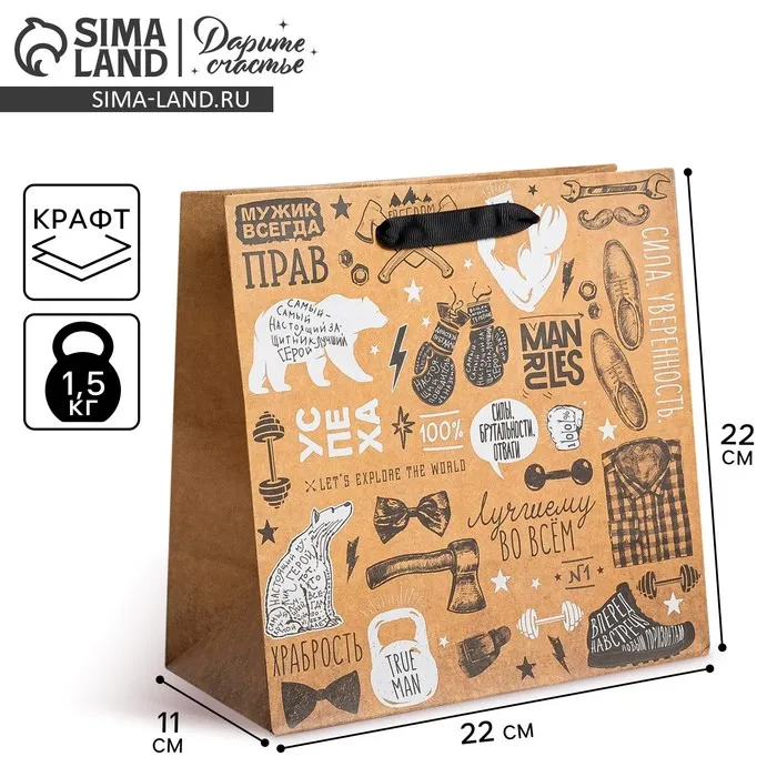 Пакет подарочный крафтовый квадратный, упаковка, «Лучший во всём», 22 х 22 х 11 см — Характеристики