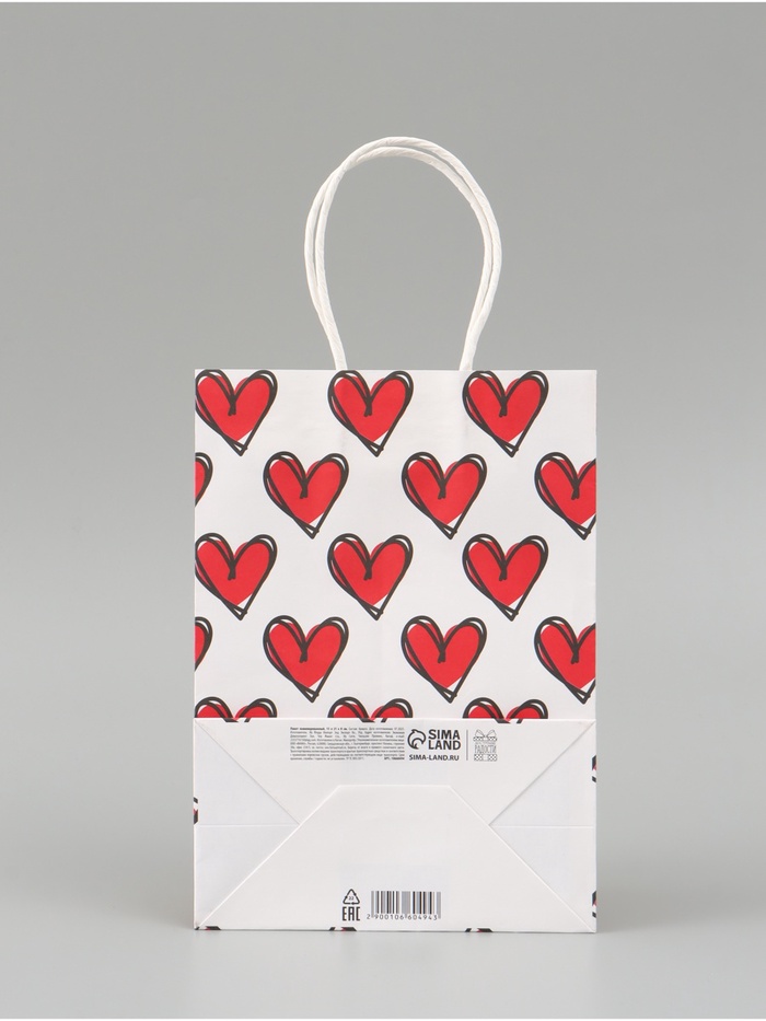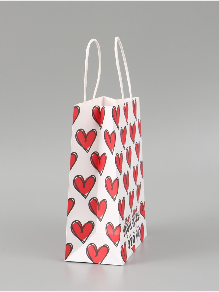 - Натуральный цвет и текстура крафт-бумаги придают пакету особый шарм и стиль, а тематические сердечки добавляют романтики и нежности.