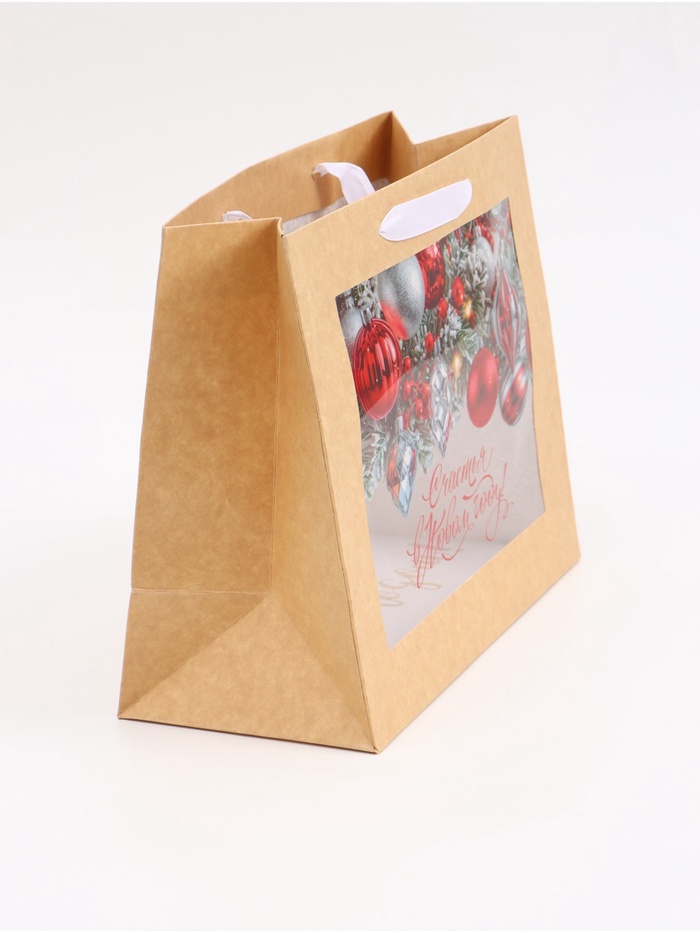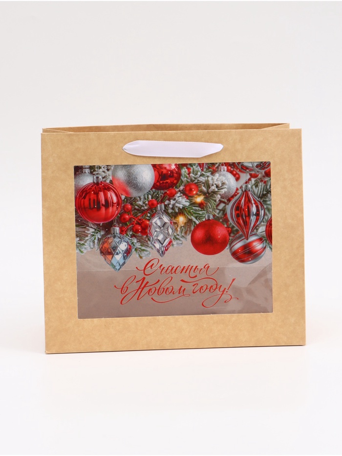 Пакет подарочный крафтовый с пластиковым окном «Счастья в Новом году», 24×20×11 см — Характеристики