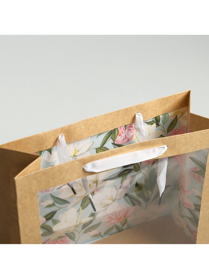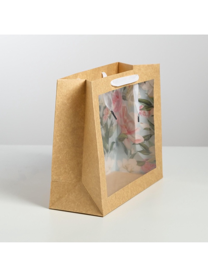 Пакет подарочный крафтовый с пластиковым окном, упаковка, «Цветы», 31 х 26 х 11 см — Характеристики
