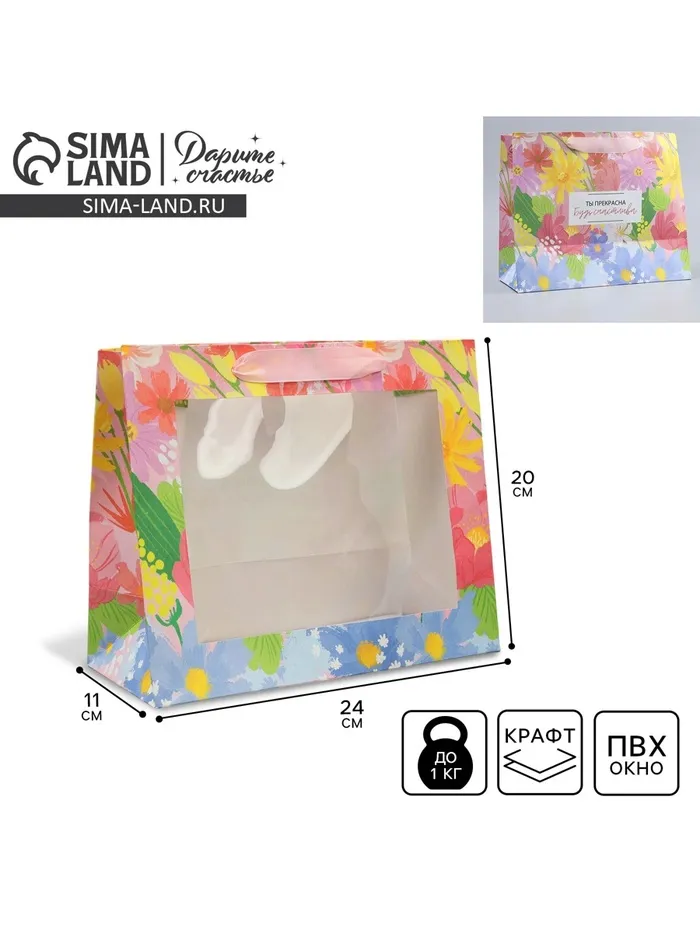 Пакет подарочный крафтовый с пластиковым окном, упаковка, «Ты прекрасна», 24 х 20 х 11 см — Характеристики
