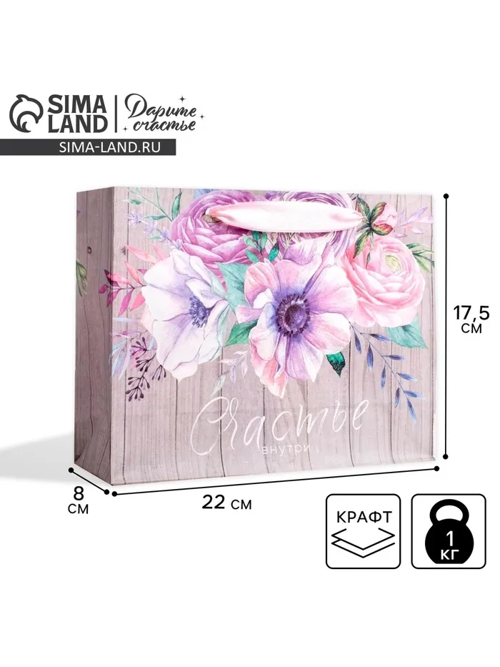Пакет подарочный крафтовый, упаковка, «Счастье внутри», 22 х 17.5 х 8 см — Характеристики