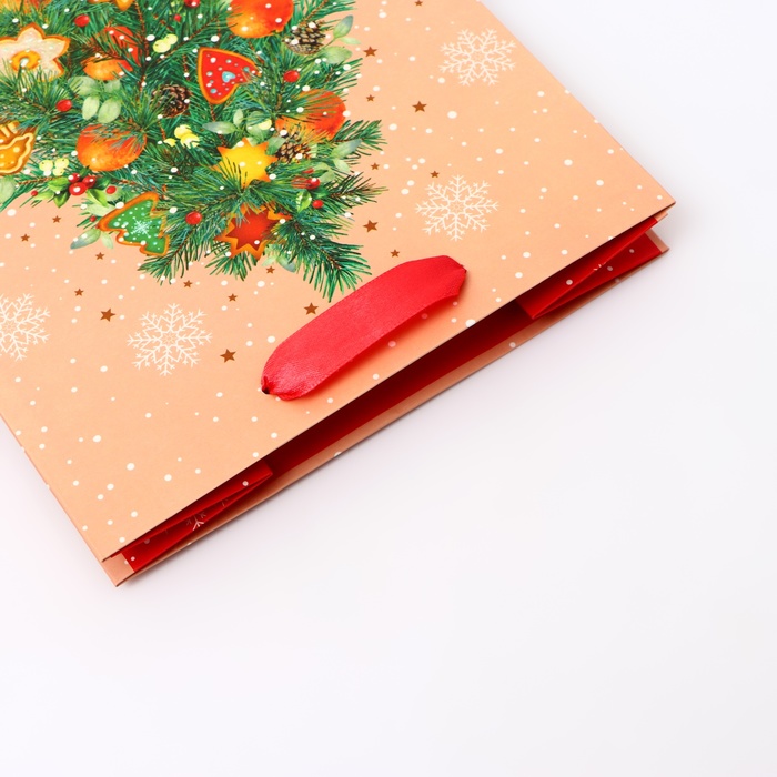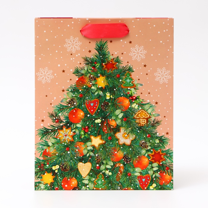 Подарочный новогодний пакет имеет оптимальные размеры, позволяющие упаковать различные предметы, от небольших сувениров до крупных подарков. Он также может быть использован для хранения и транспортировки продуктов питания, например сладких подарков под ёлку, так как материал, из которого он изготовлен, является безопасным для контакта с пищевыми продуктами.
